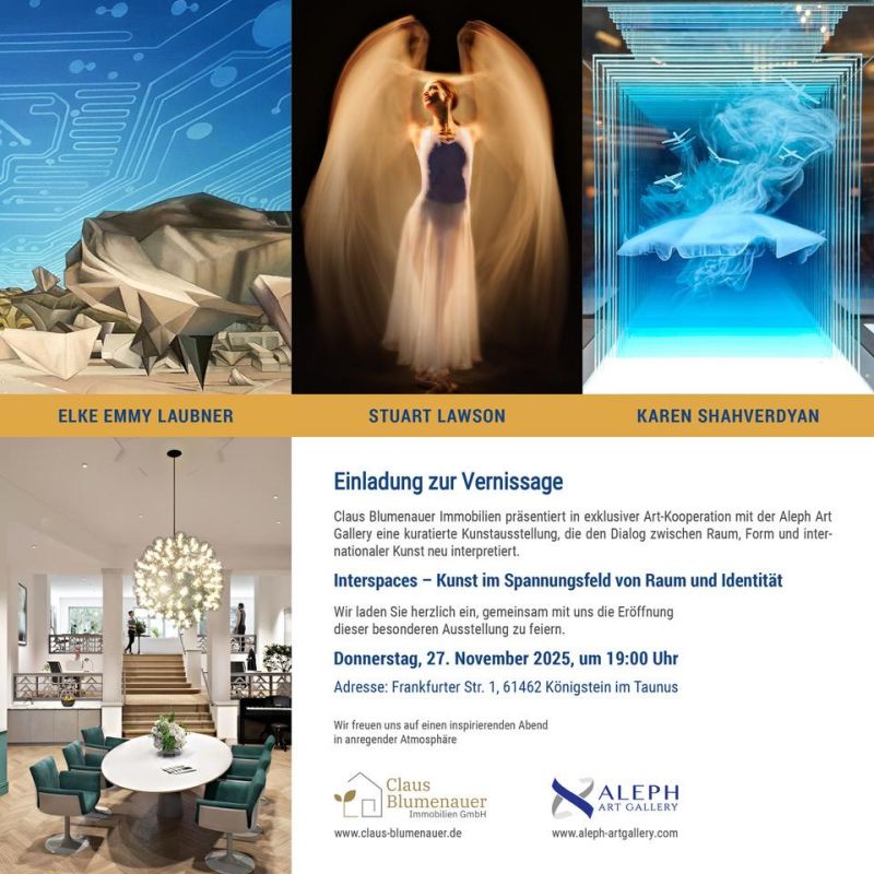 Wir freuen uns sehr, Sie heute Abend um 19:00 Uhr im Königsteinzimmer zur Vernissage „Interspaces – Kunst im Spannungsfeld von Raum und Identität“ begrüßen zu