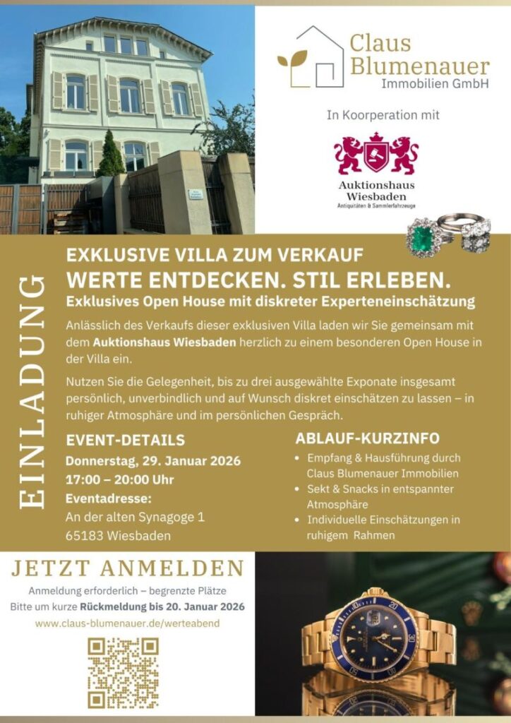 Anlässlich des Verkaufs dieser außergewöhnlichen Villa laden wir Sie gemeinsam mit dem Auktionshaus Wiesbaden zu einem besonderen Open House ein. Im Rahmen der Besichtigung der exklusiven Immobilie haben Sie die Möglichkeit, in ruhiger und stilvoller Atmosphäre bis zu drei ausgewählte Exponate persönlich, unverbindlich und auf Wunsch diskret von Experten einschätzen zu lassen – begleitet von […]